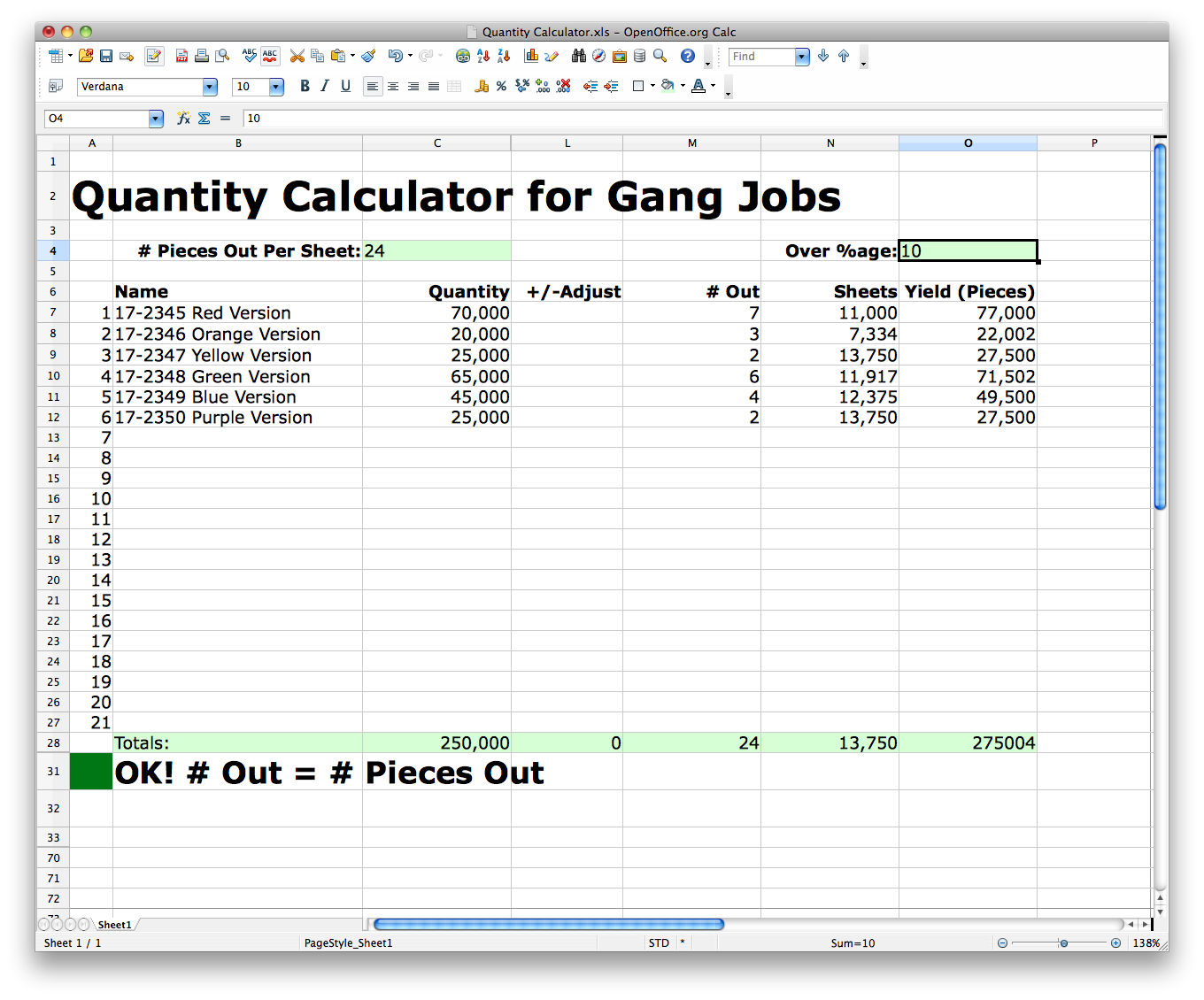 Printers often gang jobs for efficiency. This spreadsheet makes it easier to determine how many of each version to print on a sheet.